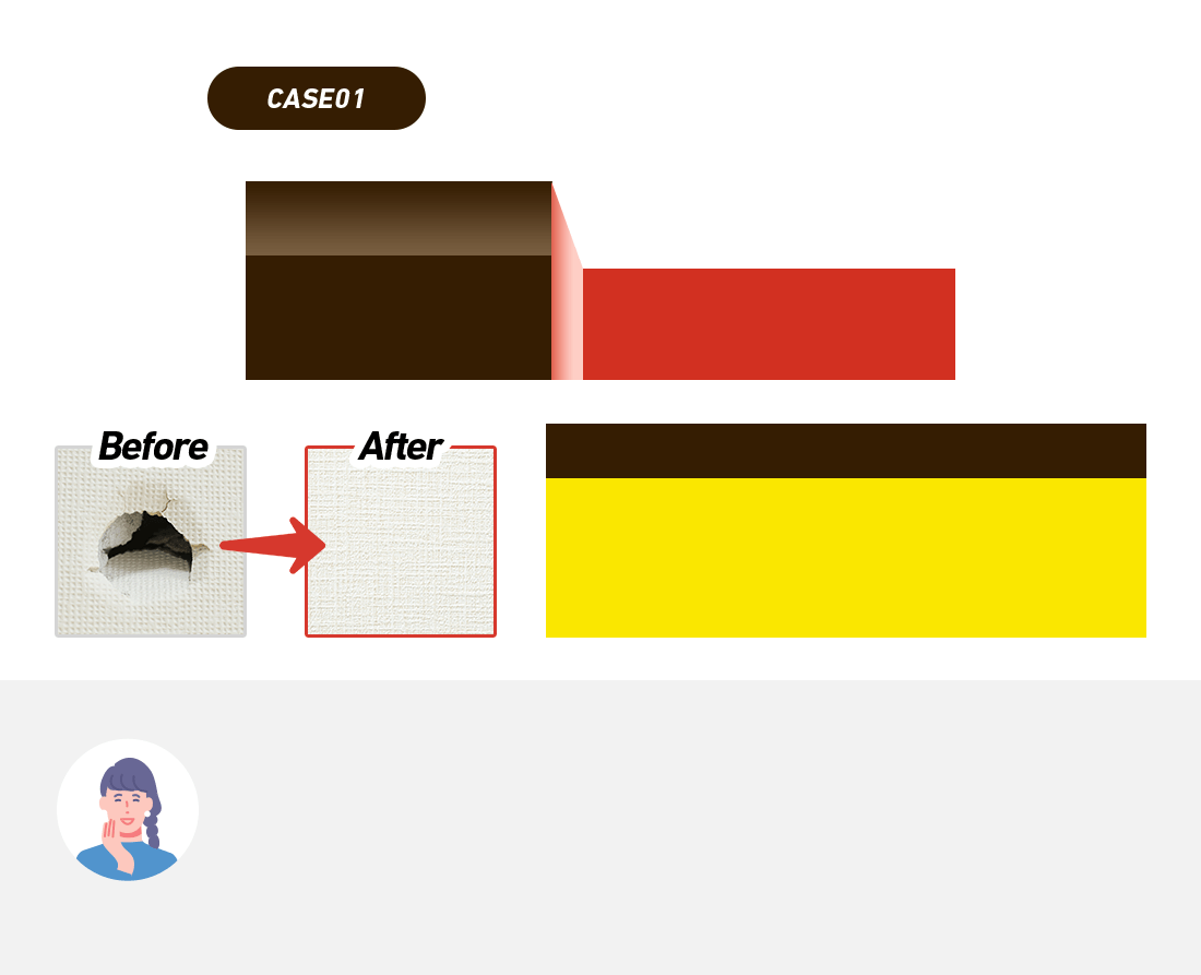 模様替えをしようとしてたら家具をぶつけてしまい、壁に大きな穴が空いてしまって・・・。不安な中、ネットで調べて出てきたところに何箇所か電話したら、内装マスターズさんが一番安く「今日中に直せます」と言ってくれて心強かったです!お願いしたら本当にすぐに来てくれてあっという間に直って驚きました(笑)